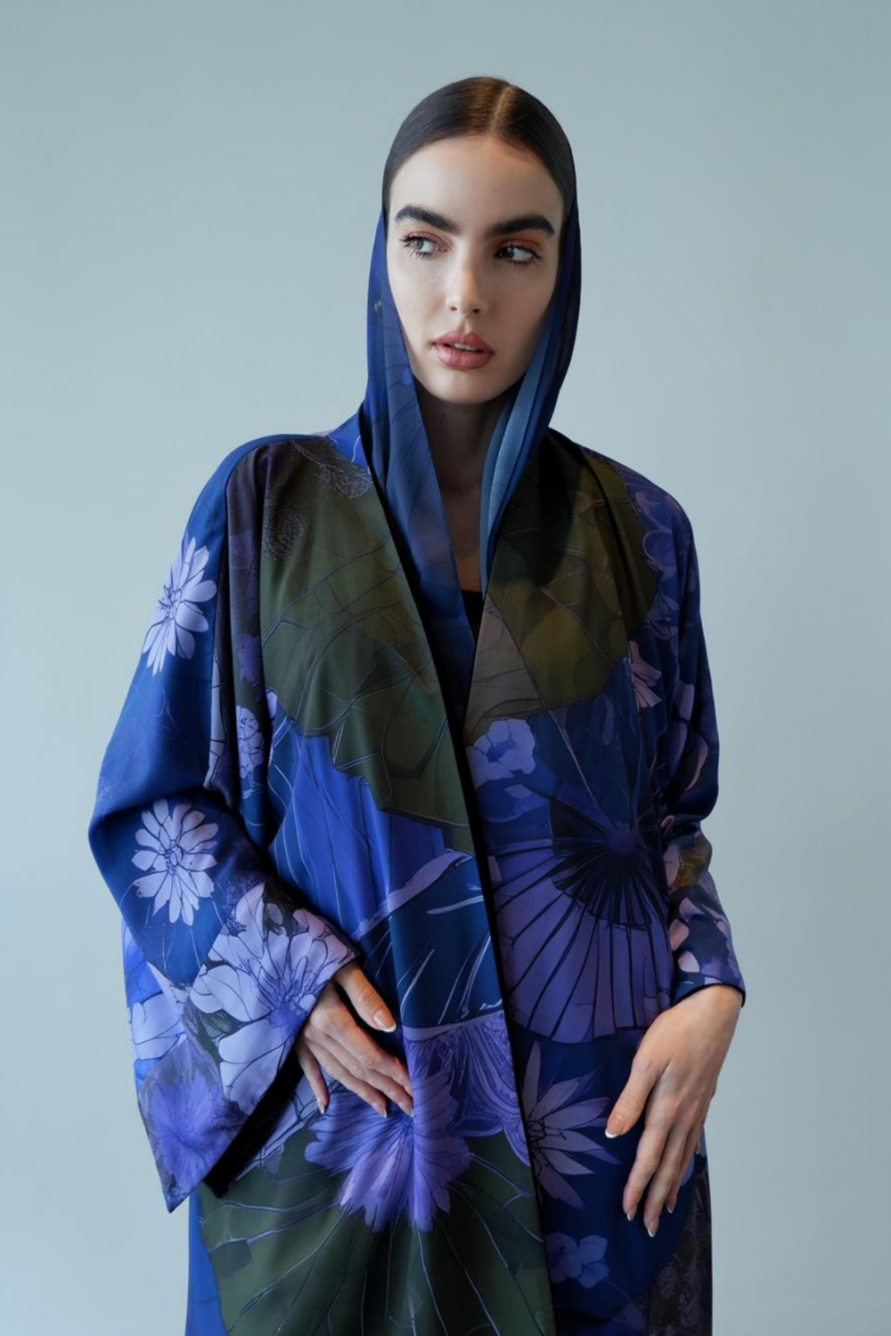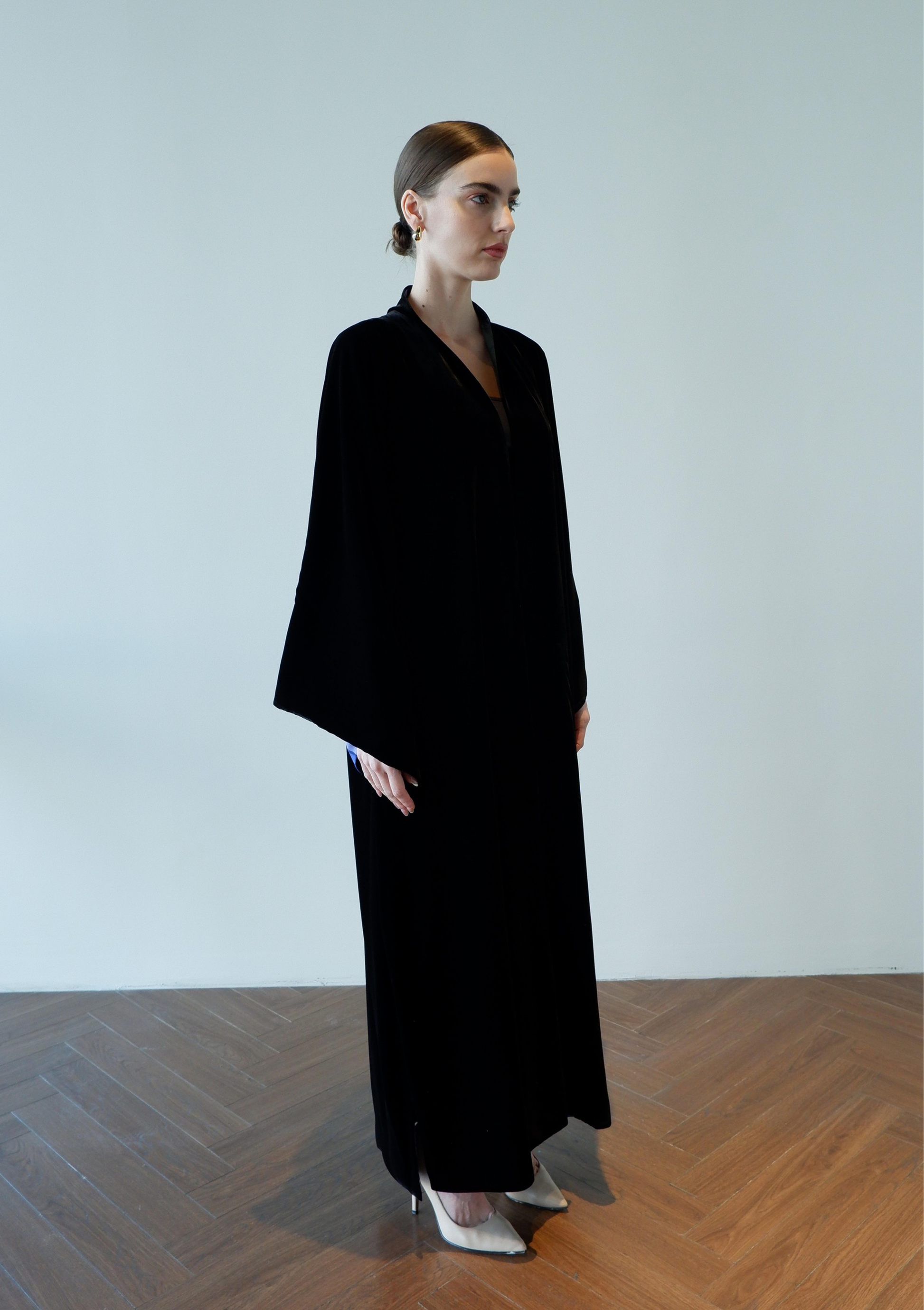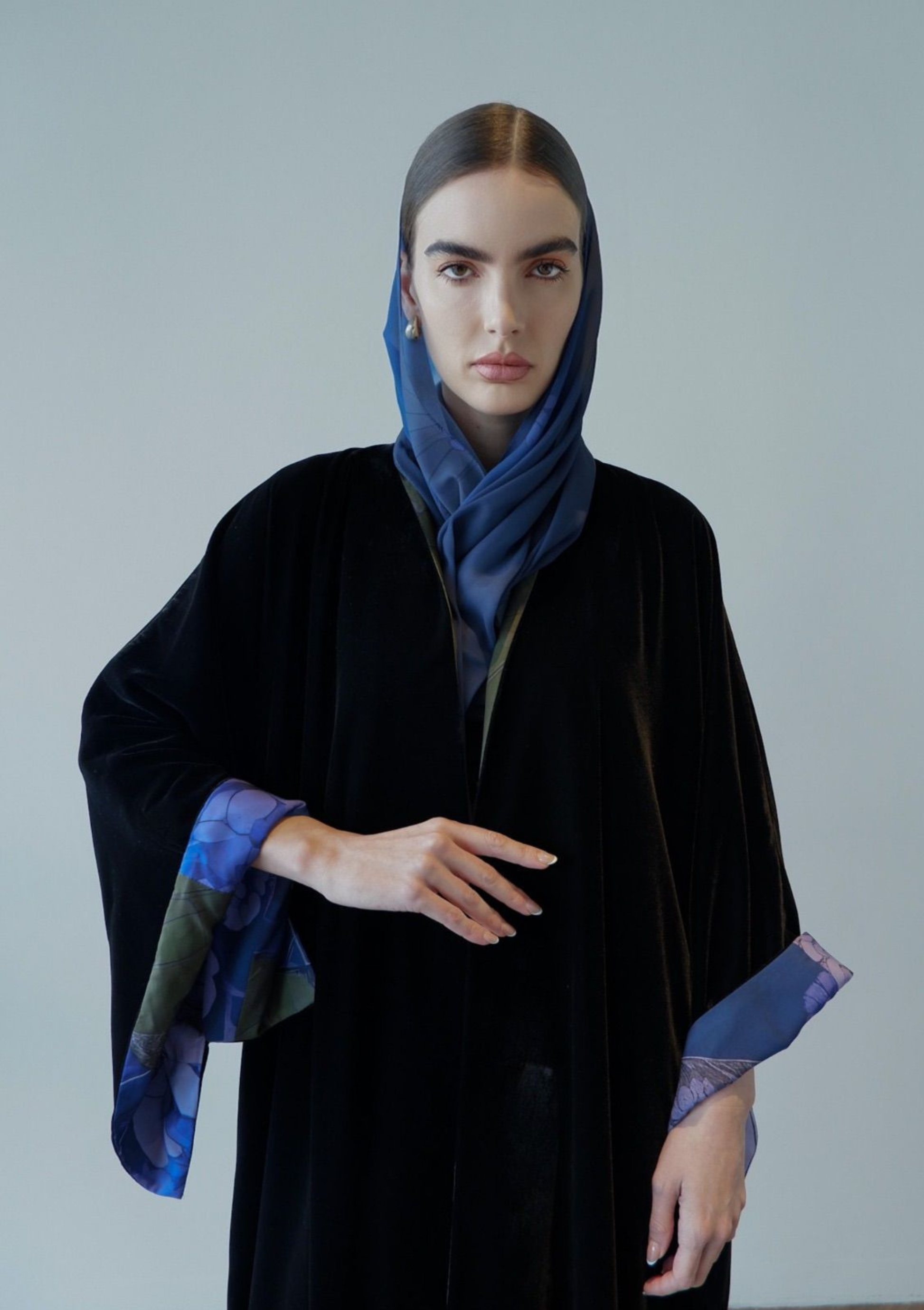 Discover understated glamour with the Petals After Dark in Black, a masterfully designed abaya that seamlessly bridges day and evening wear. This sophisticated piece showcases intricate petal detailing against a deep navy canvas, creating visual depth without compromising modest elegance.