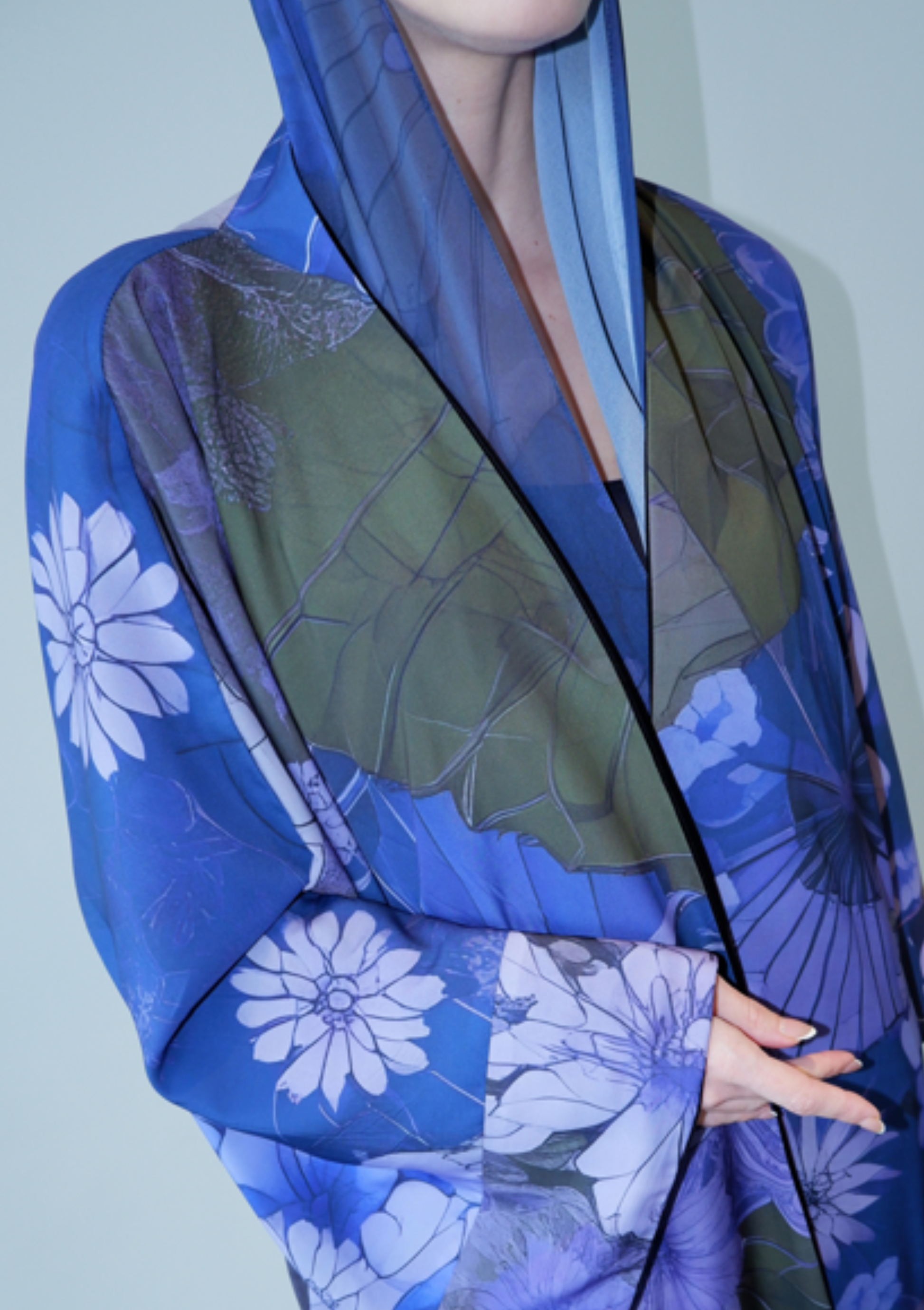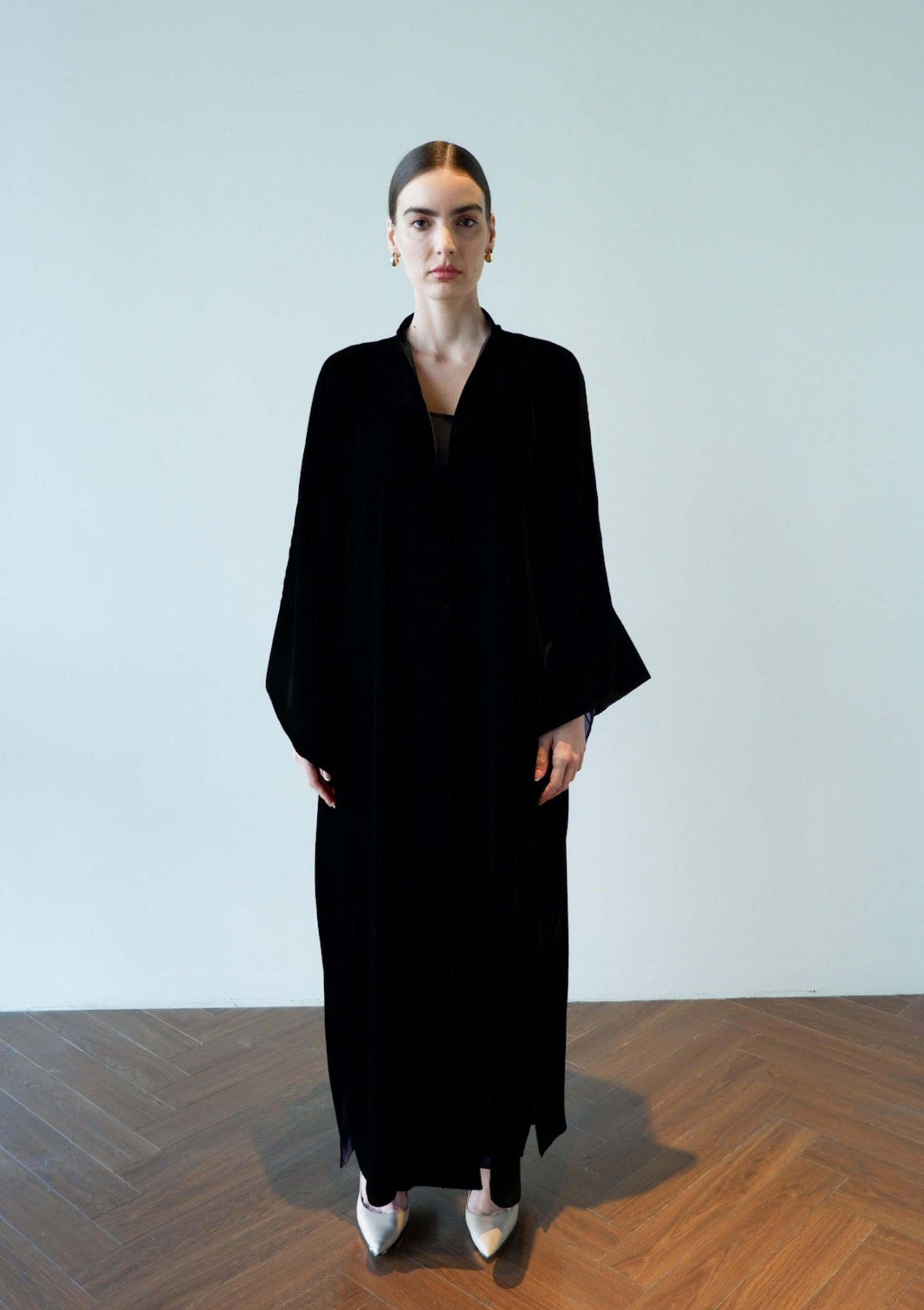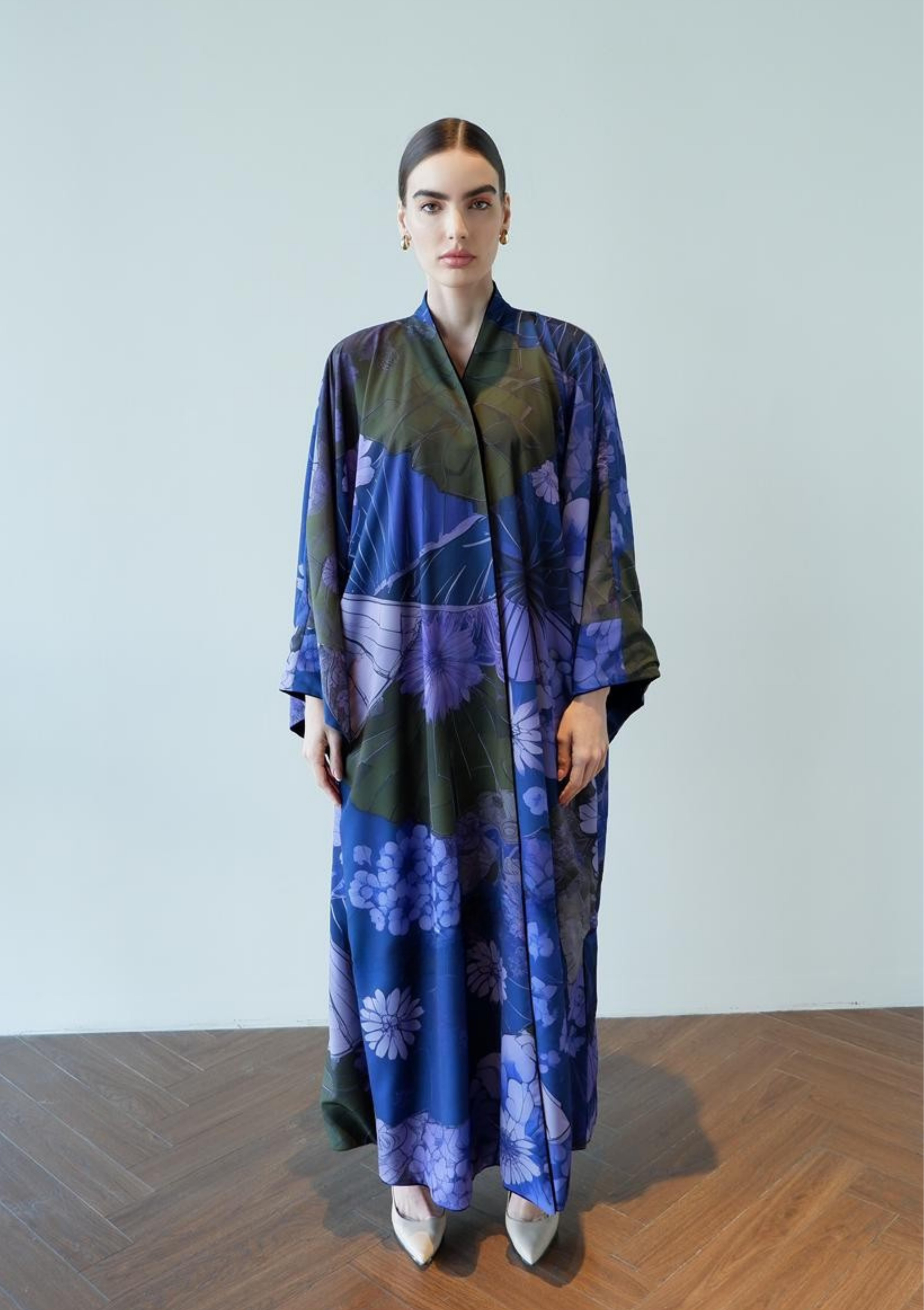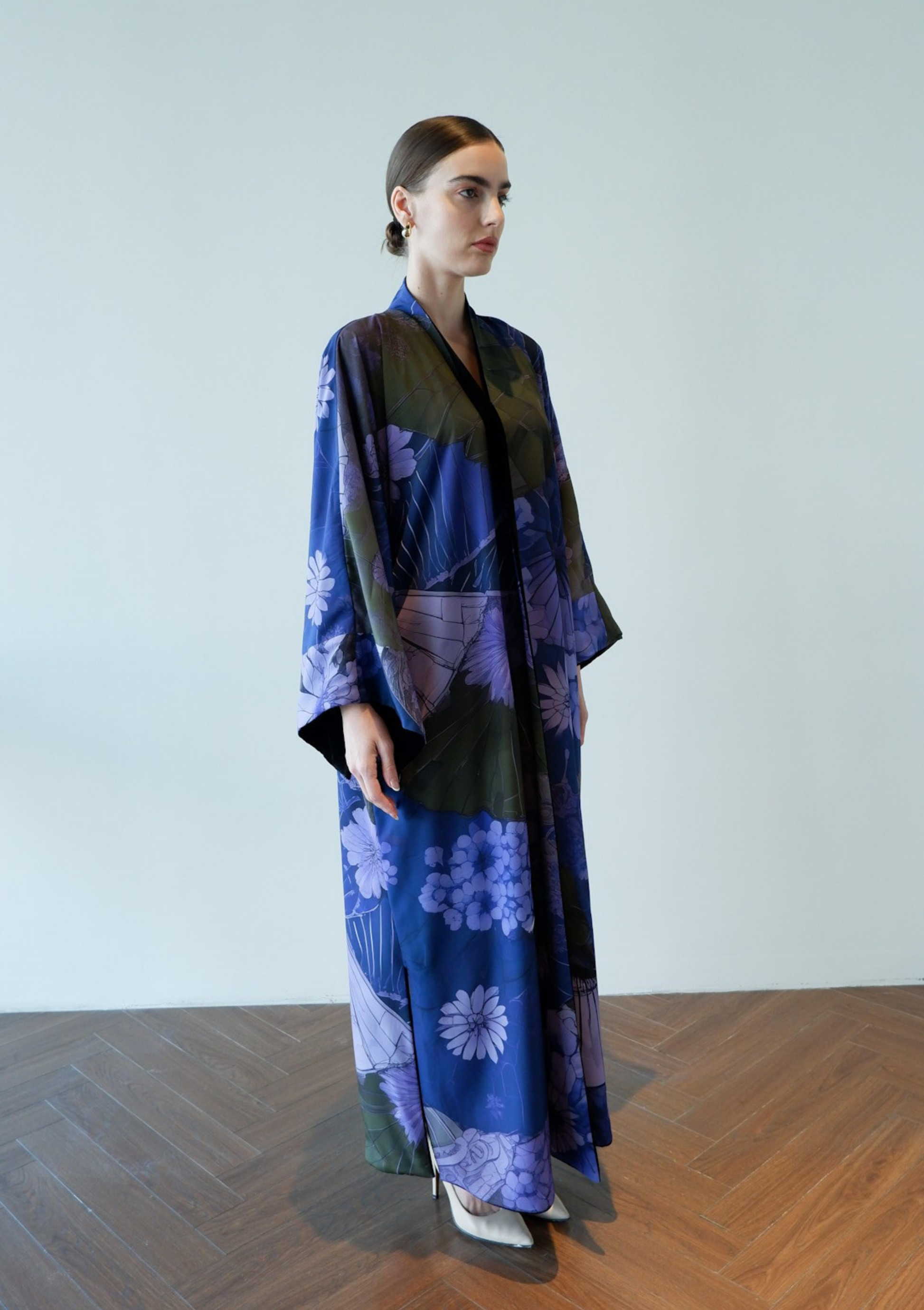Discover understated glamour with the Petals After Dark in Black, a masterfully designed abaya that seamlessly bridges day and evening wear. This sophisticated piece showcases intricate petal detailing against a deep navy canvas, creating visual depth without compromising modest elegance.